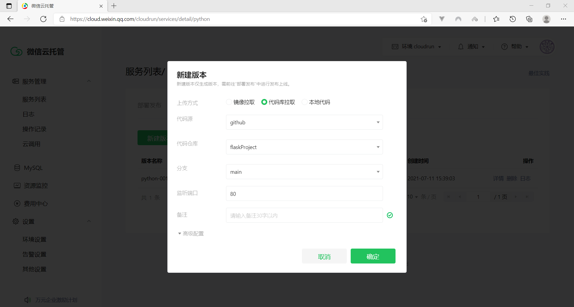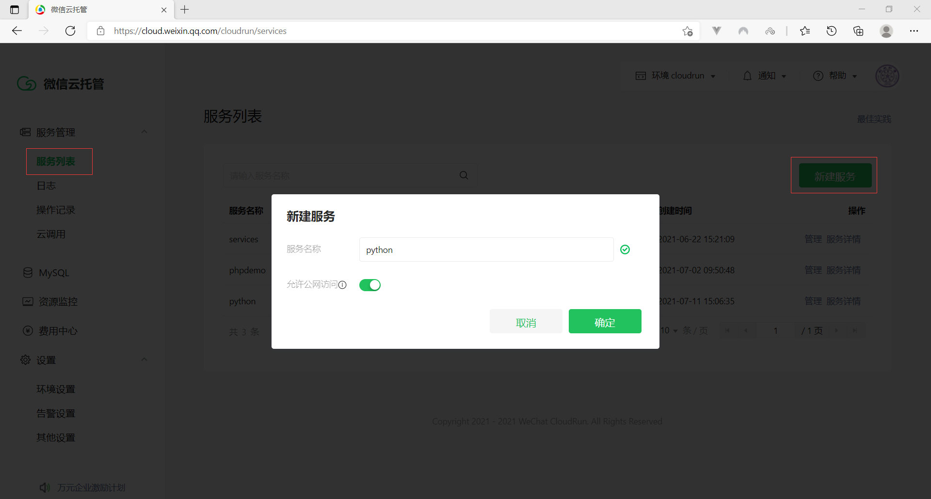 2.访问 微信云托管官网 ,创建云环境,选择服务列表,然后新建服务