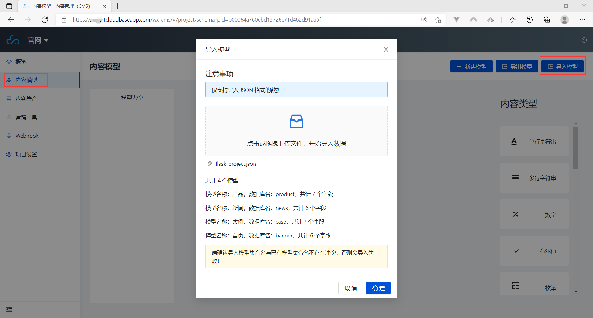 3.在内容模型中,点击导入模型,上传项目根目录下的 flask-project.json 文件
