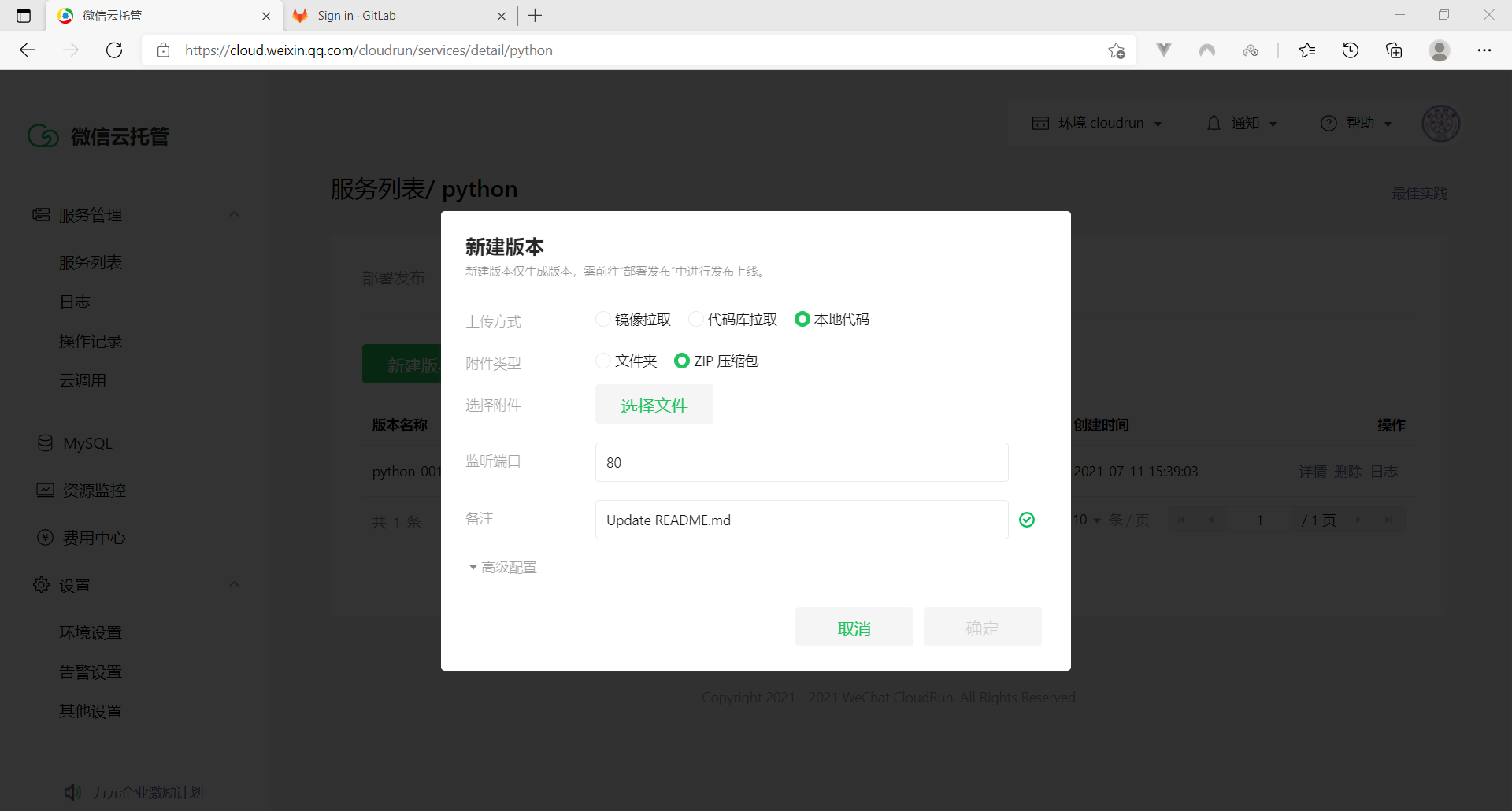 也可以选择从本地代码上传,进入项目根目录压缩文件,上传压缩包。