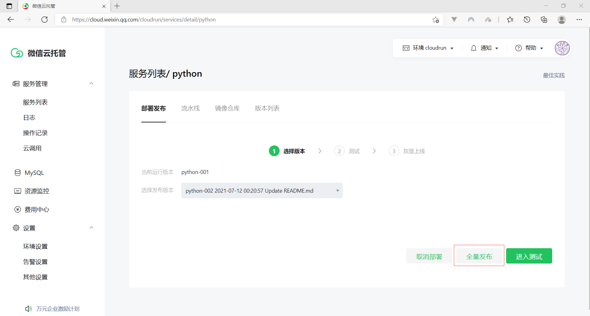 4.新建版本状态正常后,就可以到 部署发布 选项下,发布项目