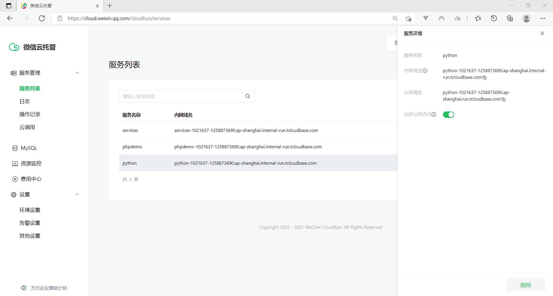 5.在服务列表选项中,点击服务详情,可以看到公网域名,复制到浏览器打开