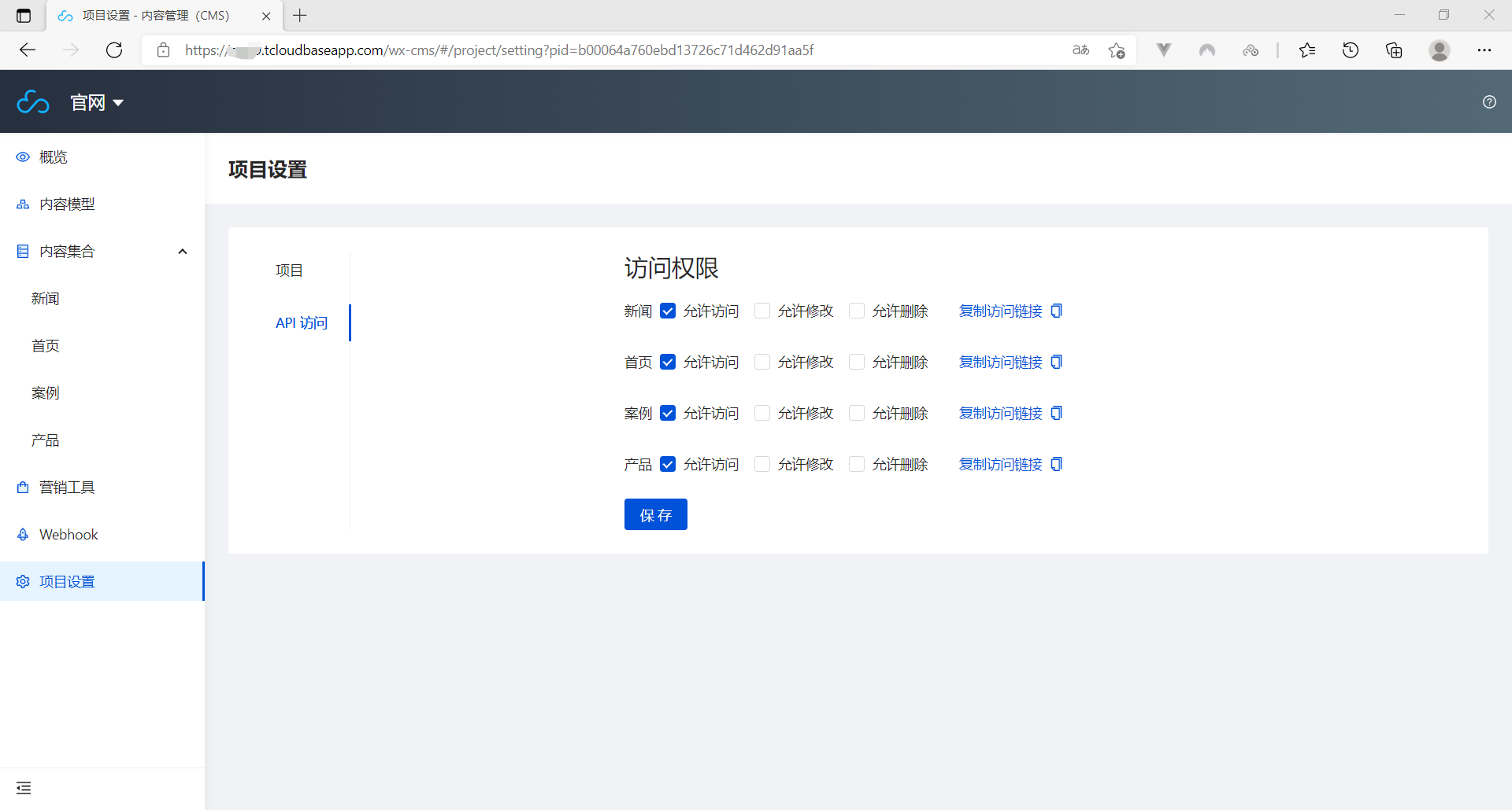 4.在项目设置中,配置访问权限(需要先到系统设置中,开启 API 访问,并保持配置路径)