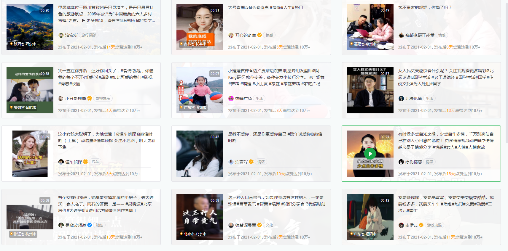 这个简短来讲,目前整个视频号的生态属于8070的主流市场,哎呀妈呀,作为一个95后刷了一会就难受的要死,我打开数据平台一看,基本全是情感相关的数据,根据这些天的测试,基本算出视频号算法,假如是按照这样的算法,实际出现现在的局面其实不足为奇!