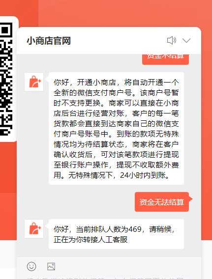 1.微信支付商户平台客服,我通过排队两个小时接通人工对话框客服,通过沟通,回复大致意思是,需要等待小商店结算资金,让我找小商店客服。
