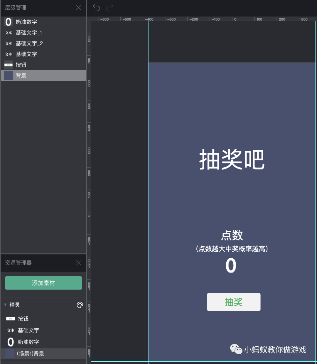 接着,我们布置一个简单的场景。一个抽奖按钮,一个当前的点数,一个是否中奖的提示。