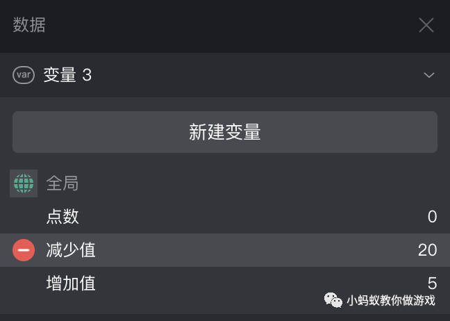 接着,创建三个变量。如果未中奖,点数就会加上“增加值”,如果中奖了,点数就会减去“减少值”。