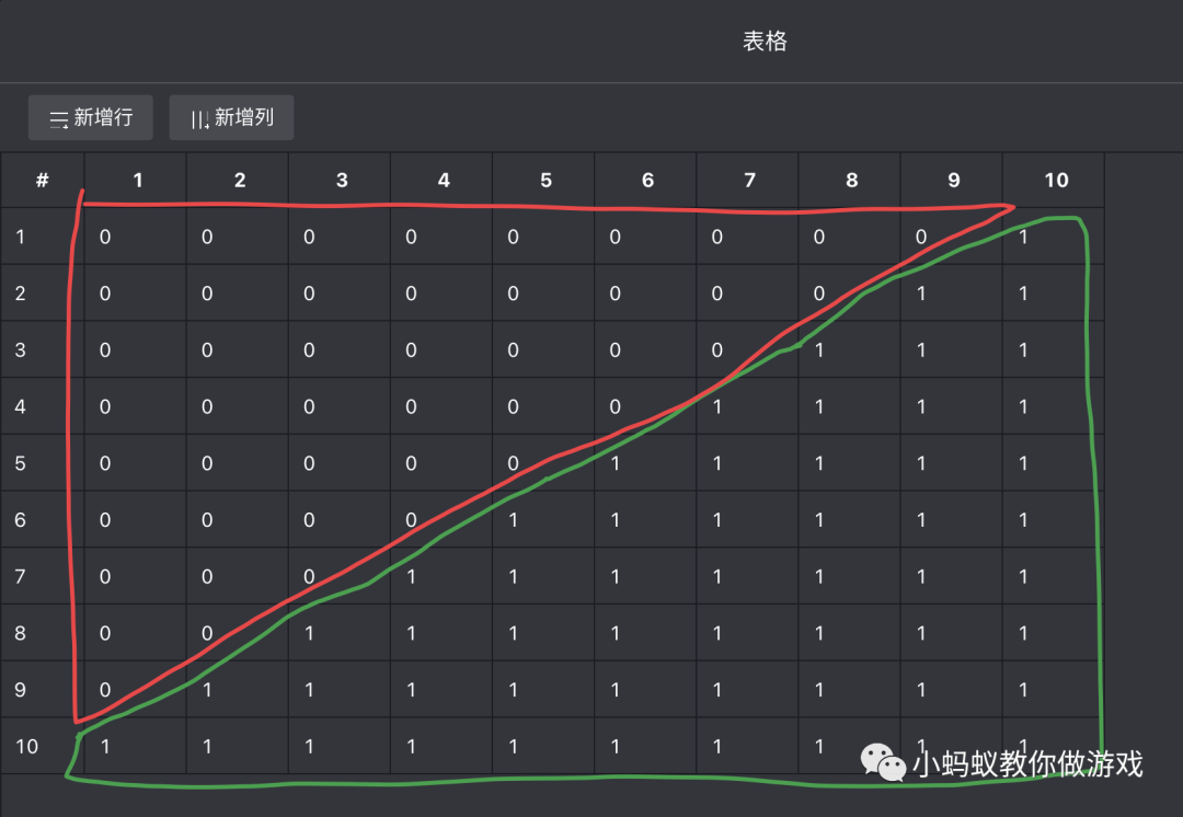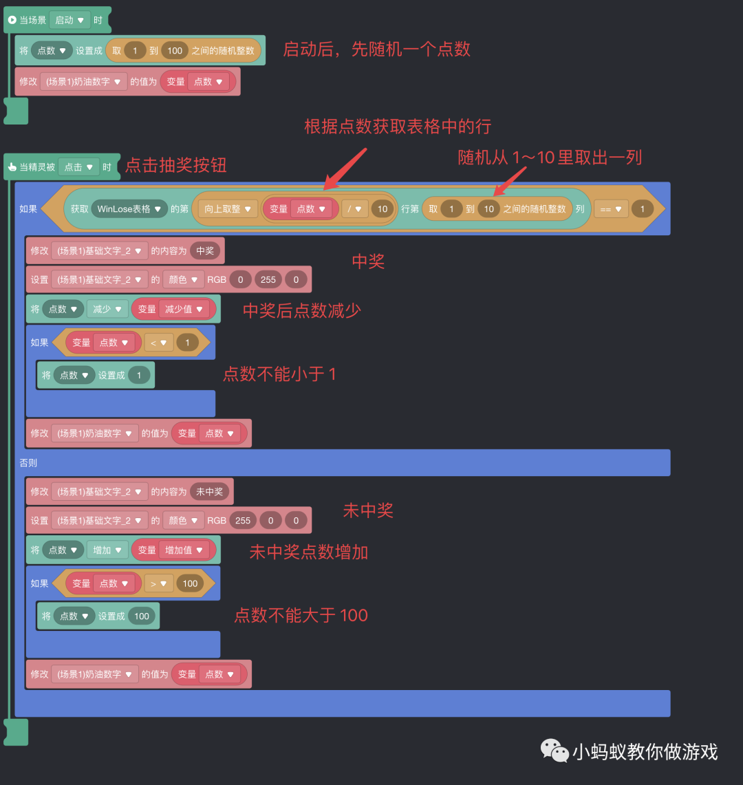 逻辑其实很简单,点击抽奖时,使用当前的点数除以 10 ,然后向上取整,可以得到表格中的行号,得到行号后,从 1~10 中取出一个随机数当作列号,抽取表格中的数判断是否等于 1,等于的话表示中奖,将点数减少。不等于的话表示未中奖,将点数增加。