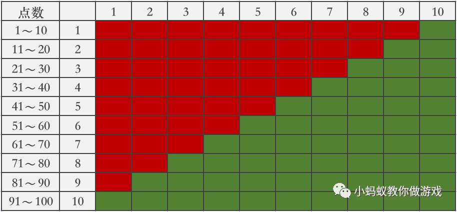 如图,就是一个 WIN-LOSS 表格,书中使用的是 16 进制,为了方便理解,我对其进行了修改和简化,改成了 10 进制,不过原理都是一样的。第一列表示的是点数,每个点数区间包含 10 个数字,右侧红色的格子表示不中奖,绿色的格子表示中奖。点数在 91 ~100 的时候,必定会中奖,点数在 1~10 的时候,基本上不会中奖,也就是说点数越大,中奖的概率就会越高。
