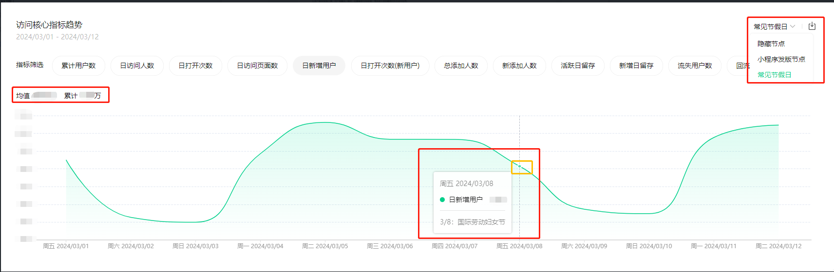 「访问核心数据」主要是小程序的活跃、拉新、留存、流失及回流概况,从指标卡和趋势图可以快速清楚掌握当日数据、相比较前面的数据的变化率以及指标在一定时间范围的变化趋势。同时指标趋势图左上角有的指标是有这段时间的均值和累计,可与此对比分析;右上角这里可以选择节点,(下图2)选择了常见节假日,趋势图中则有节点显示,方面快速掌握节假日是否有数据波动。