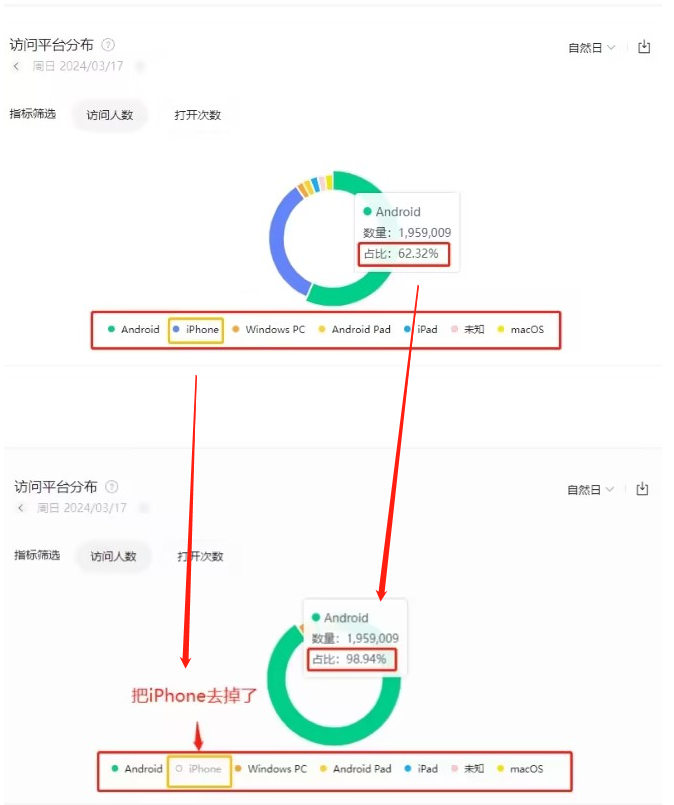 (下图) 访问平台分布饼图,要看具体占比,若如想看去掉某个类型后的各个占比,可以这样快速操作。