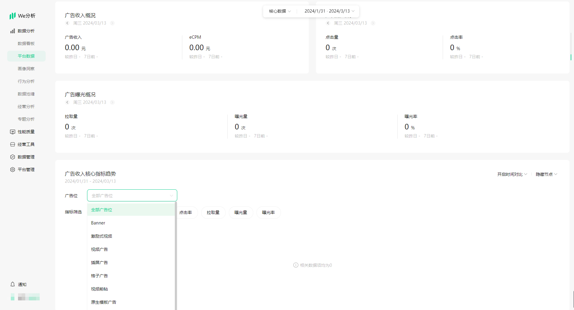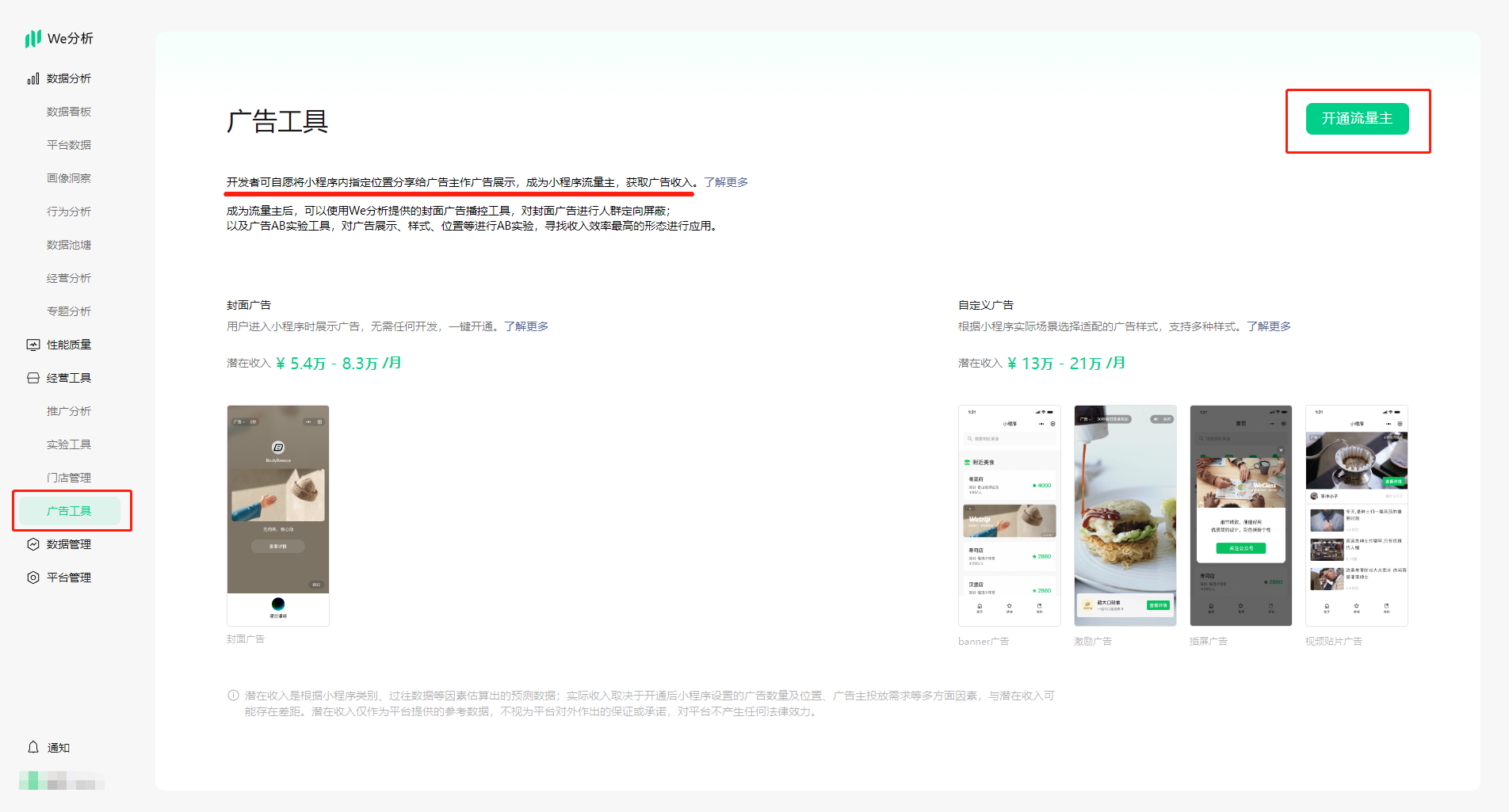 「广告收入核心数据」仅面向开通流量主的小程序展示,开通流量主即是开发者可自愿将小程序内指定位置分享给广告主作广告展示,成为小程序流量主,获取广告收入。