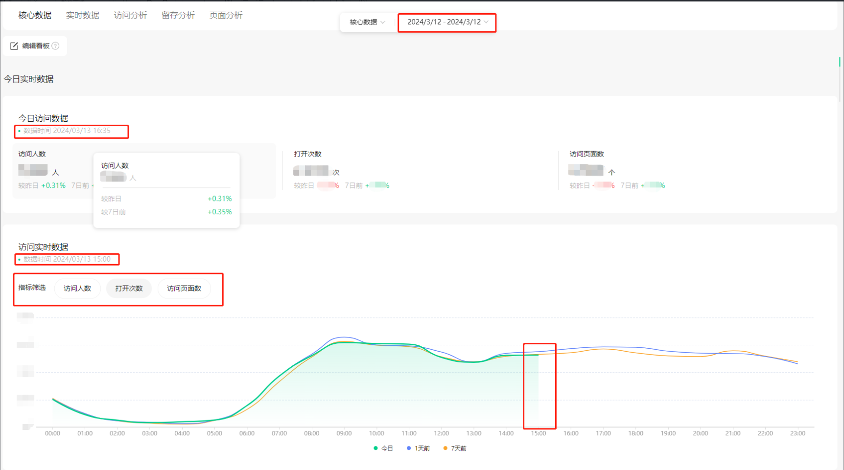 「实时数据」的日期时间不随时间筛选器的时间改变,一直是实时的时间,指标卡可以看到今日截止到当前的实时数据以及较昨日和较7日前的变化率,趋势图可以筛选所看指标,看到今日截止到当前的数据趋势。