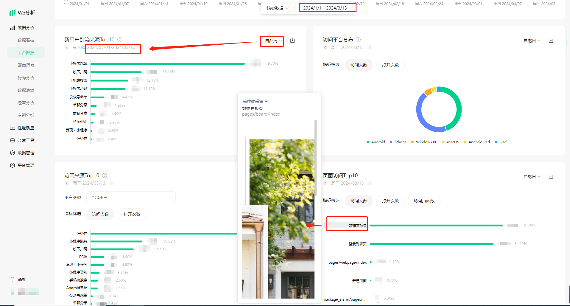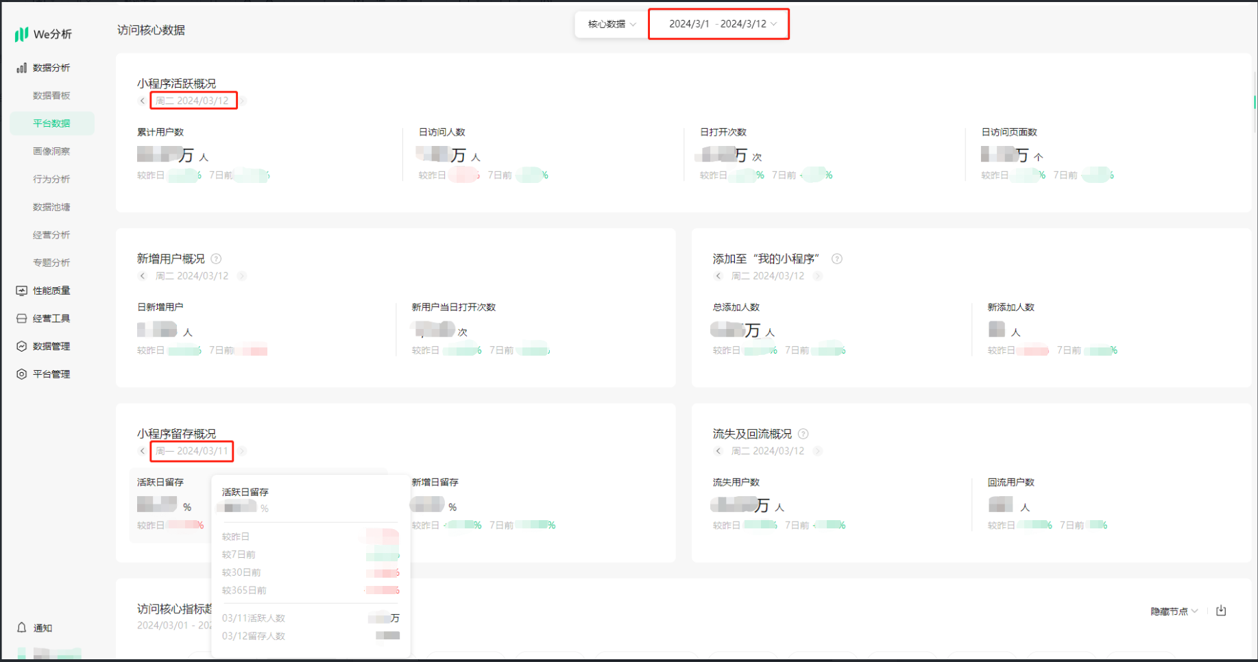 平台数据:提供官方统计的各项平台数据,包含访问、留存、页面、交易等多种小程序经营过程中所需关注的重要统计指标。无需进行数据接入,便可快速掌握小程序整体的运行情况。