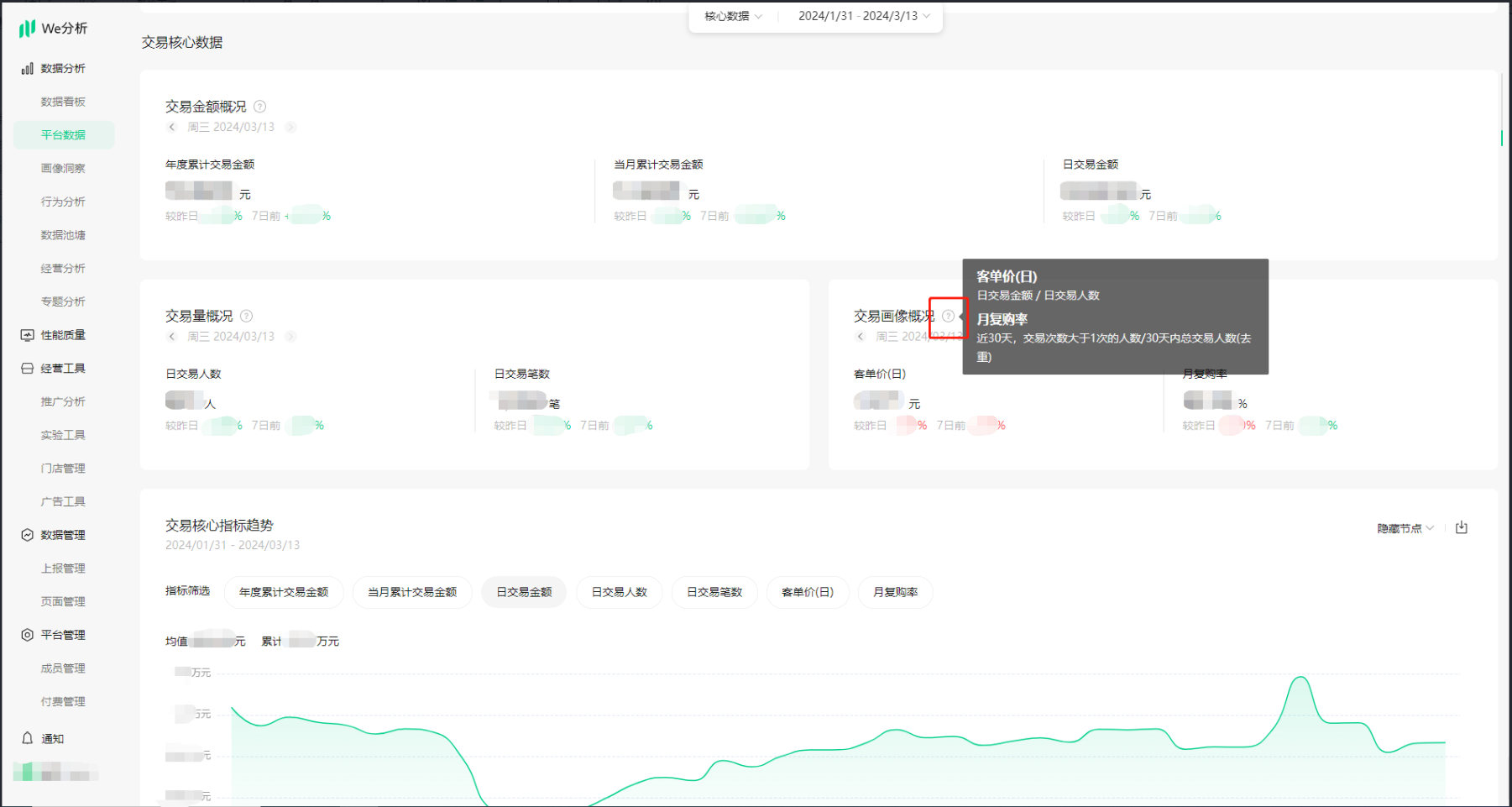 「交易核心数据」仅面向开通微信支付的小程序展示,也是以指标卡和趋势图展示,在一些地方有小问号的(下图),是备注和解释。「交易核心数据」方便快速掌握交易概况–交易金额、人数、次数、客单价及复购率,帮助快速找到问题。