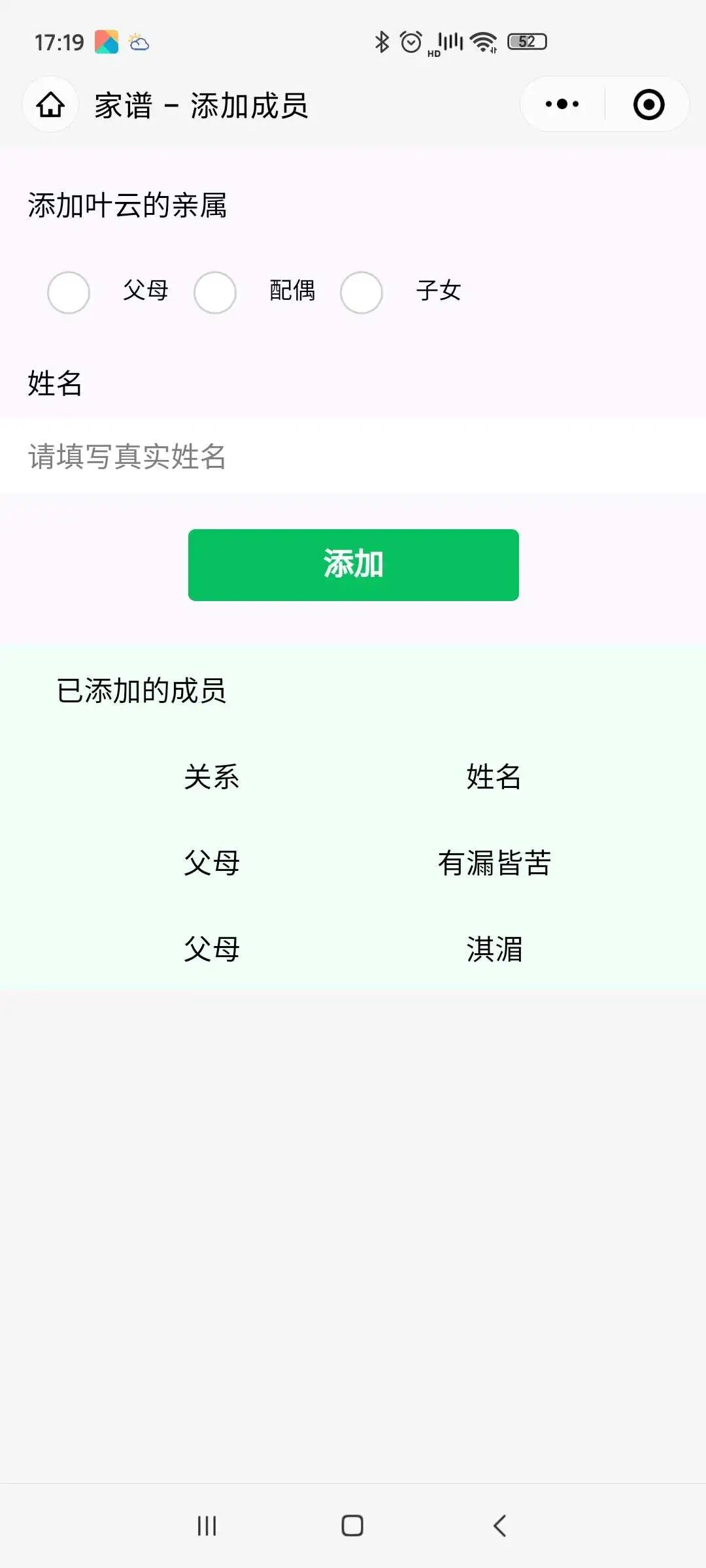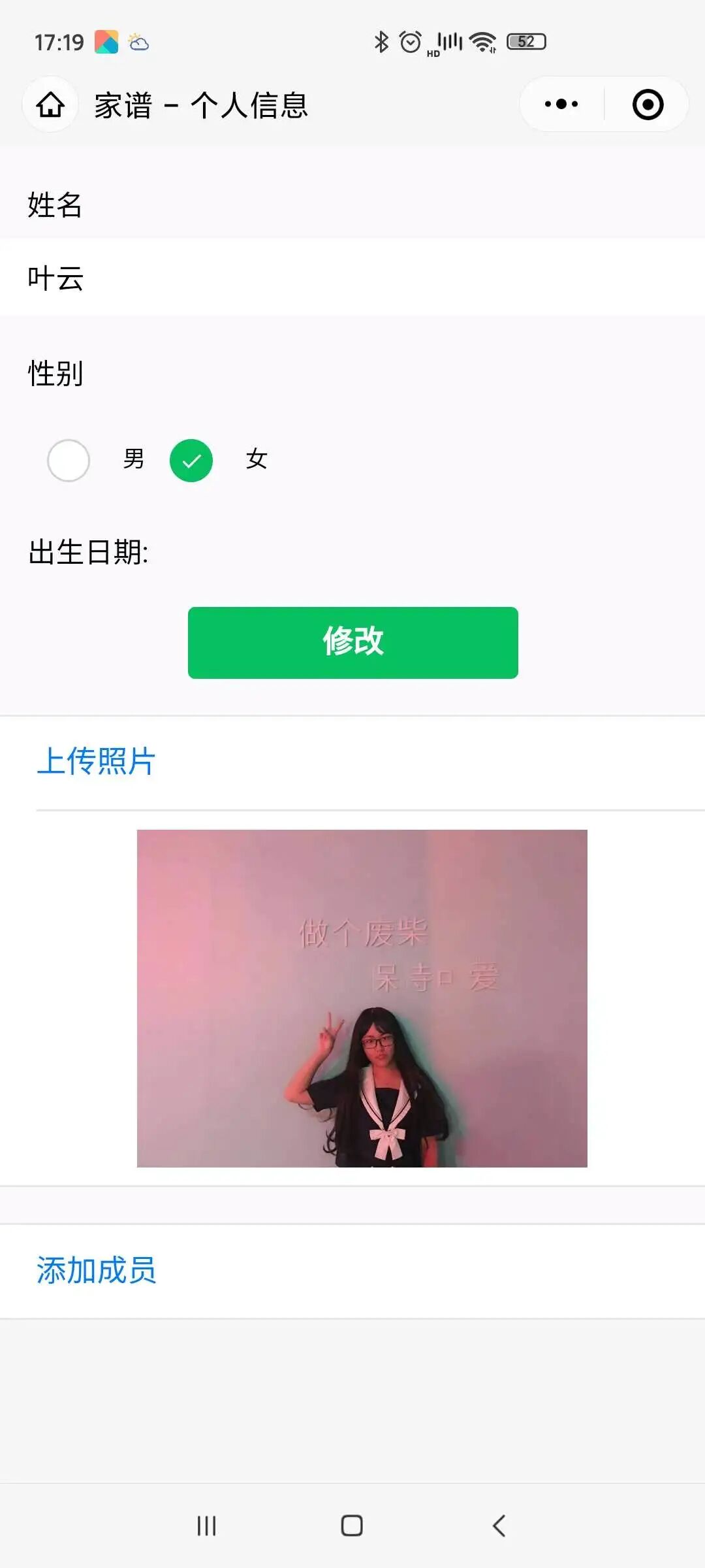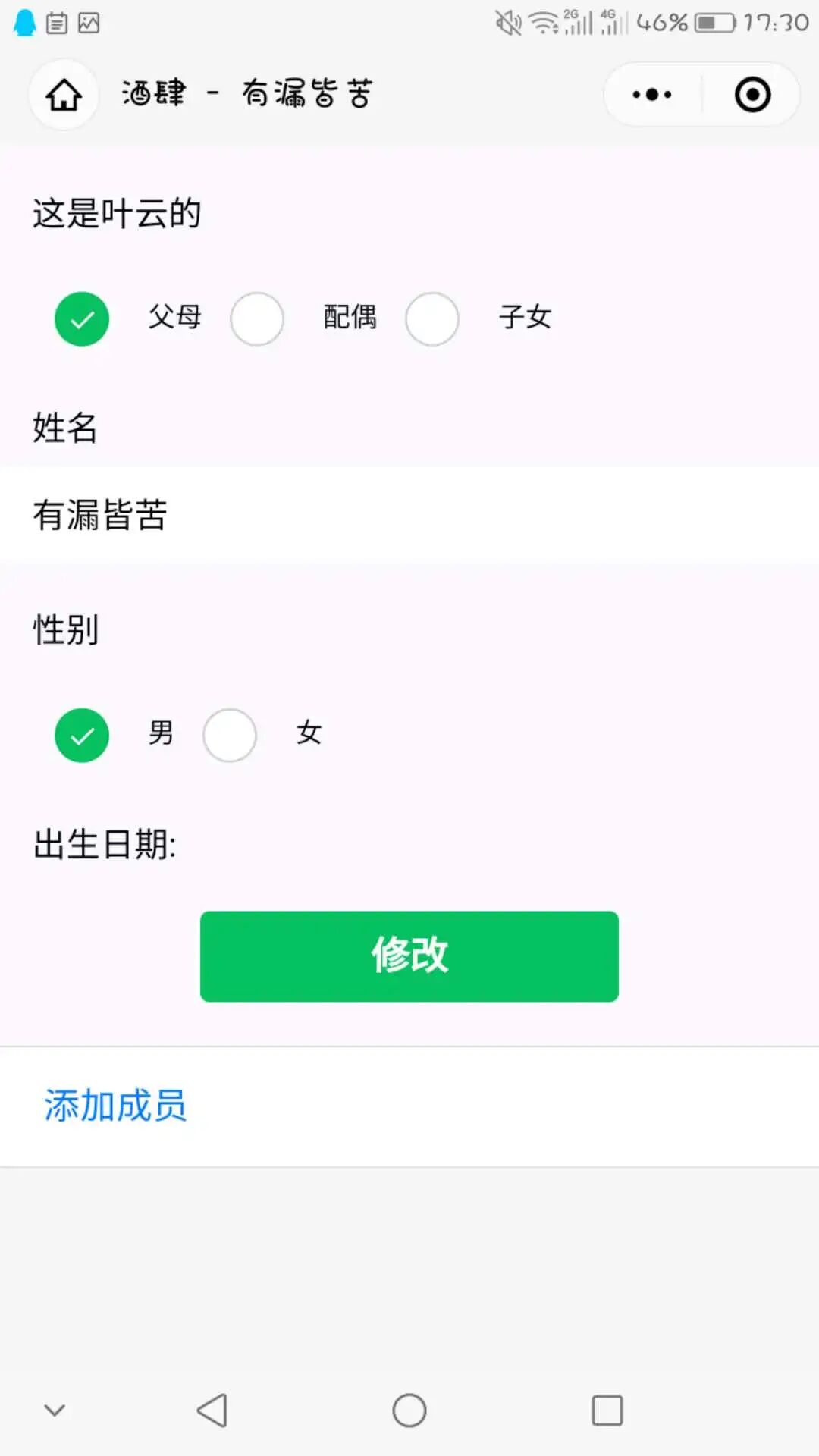 ——操作方面:填写个人信息,添加家庭成员为一级亲属,补充一级成员信息,为一级亲属添加家庭成员,逐渐形成关系网。同时个人信息界面可上传照片,个人照片与全家福均可。