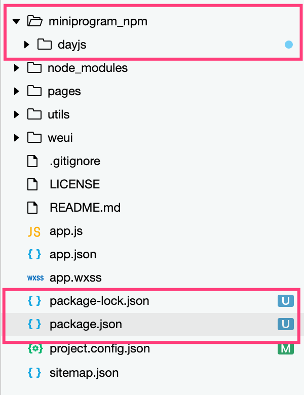 前面三个是 npm 初始化时,默认生成的,最后一个目录是开发者工具构建 npm 时生成的,可以理解为小程序版的 npm 包。