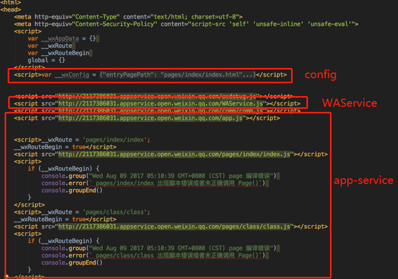 那么在不同平台上,逻辑层是如何承载的呢?开发者工具中的Serivice也是一个运行在Chrome中的一个html页面,这个页面加载了三部分JS,如: