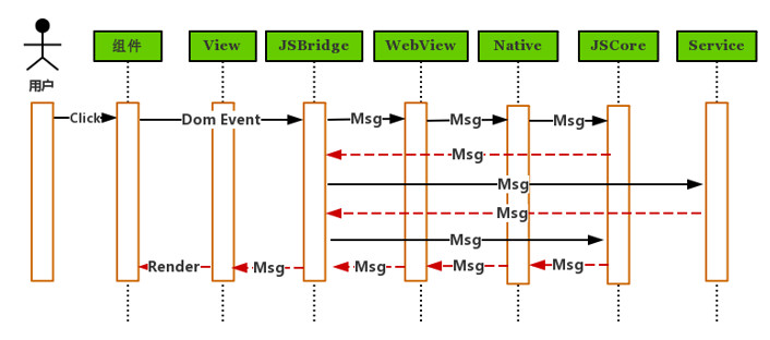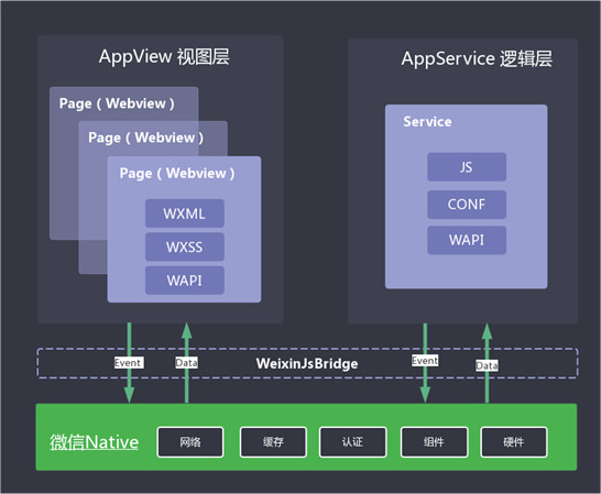 小程序的架构包含view视图层和appService逻辑层。view层即我们看到的页面结构和表现(wxml和wxss),由一个webview承载。appService层即是JS和JSON的代码,也就是我们的主要的业务逻辑部分,在不同的平台下由不同的部分承载。最下面是Native部分,提供基础能力,三部分之间的通讯是通过消息的方式来实现的。