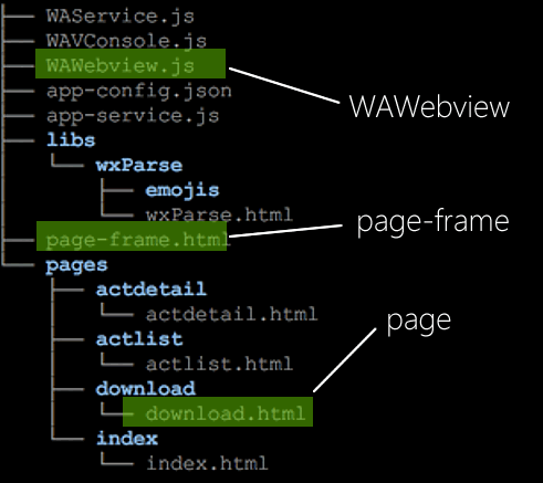 WAWebview主要是封装了这些模块:基础组件,WXAPI,渲染,事件处理,wxJSBridge等。