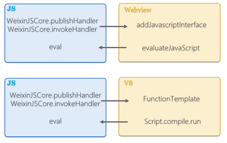 在ios中,通过 WKWebview的 window.webkit.messageHandlers.NAME.postMessage 实现,微信navite代码里实现了两个消息处理器:invokeHandler( 调用原生能力) 和 publishHandler( 消息分发)。js可以和webview和jsCore通信,图中分别列出其通信的方法: