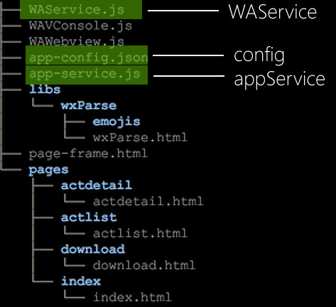 WAServer.js主要包含了这些模块:模块实现,全局api(getApp,PagePage等),jsBridge等。