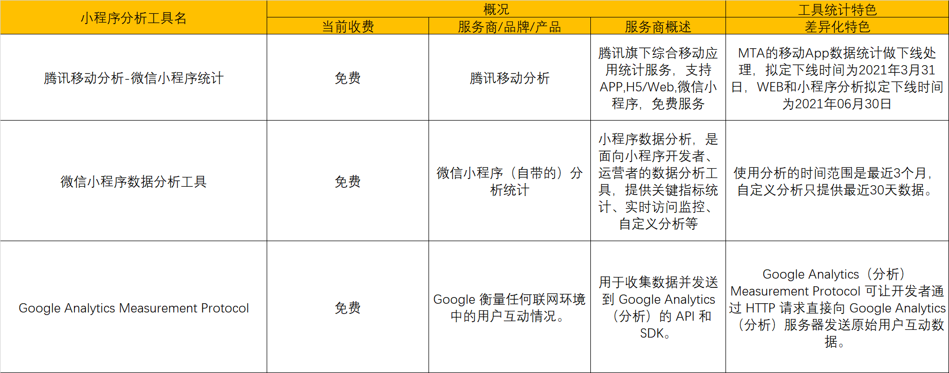 小程序数据分析工具当前免费的三种统计对比。如果不在意分析数据的展示时间,可以选择微信自带的小程序数据分析工具。
