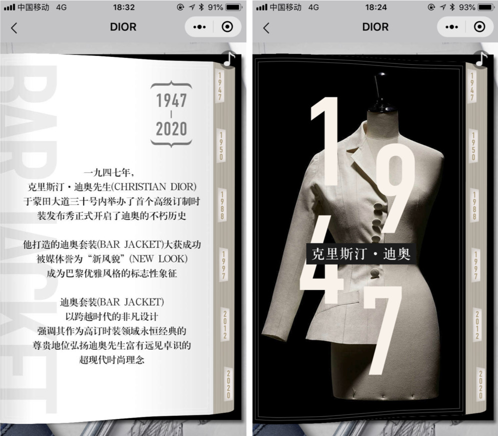 还将经典套装(BAR JACKET)不朽历史“装订成册”供用户翻阅,图文并茂的演绎了七十余年来DIOR跨越时空的超凡设计。