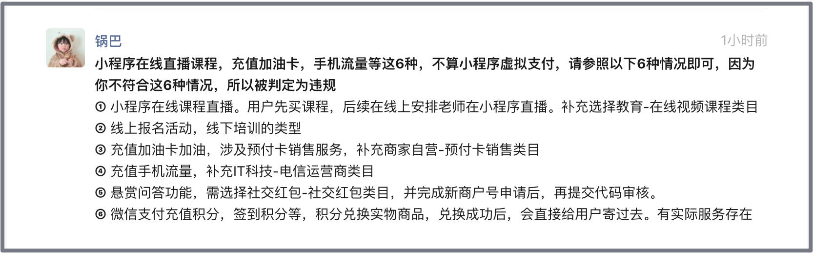小程序在线直播课程,充值加油卡,手机流量等这6种,不算小程序虚拟支付,请参照以下6种情况即可,因为你不符合这6种情况,所以被判定为违规