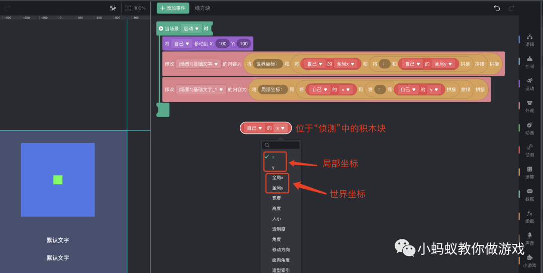 如图,“x,y”表示的是局部坐标,“全局x,全局y”表示的是世界坐标,我们使用基础文字显示出绿色方块的这两种坐标。