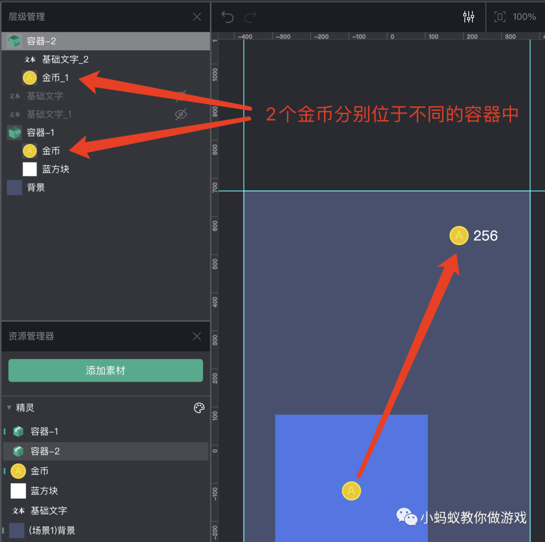 如图,两个金币分别位于两个不同的容器中,我要做的是让下面的这个金币飞到上面的那个金币的位置上。