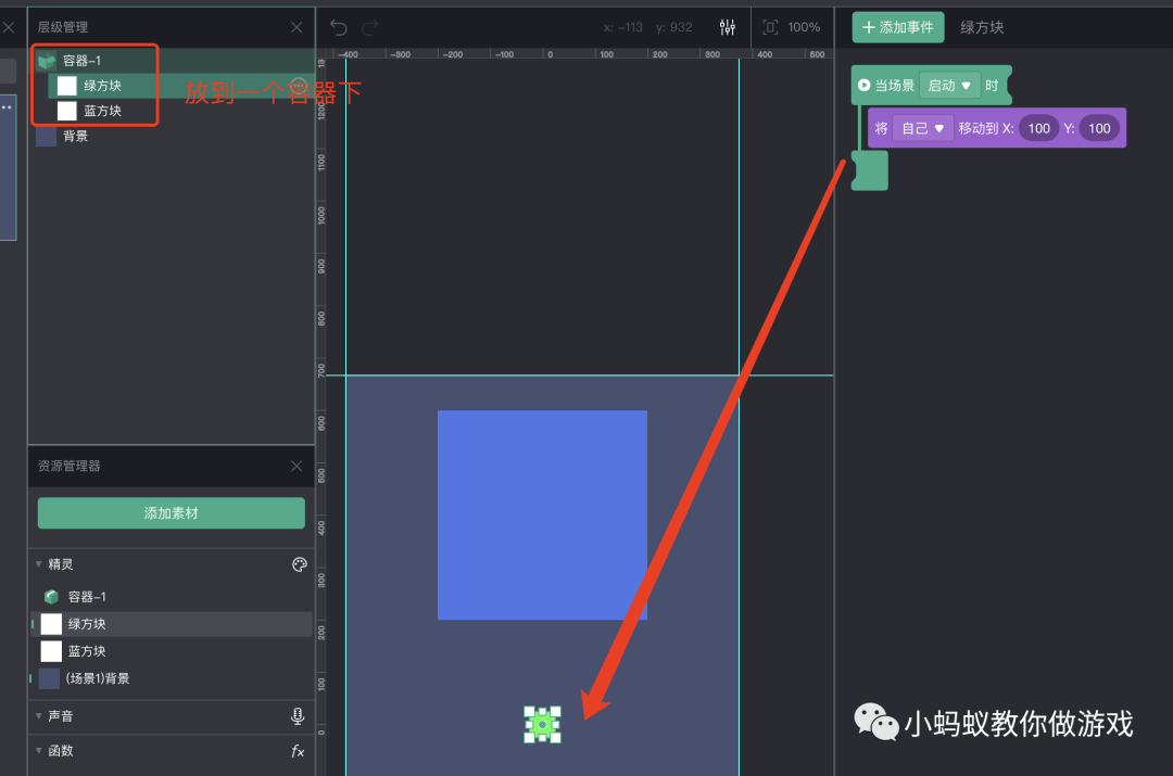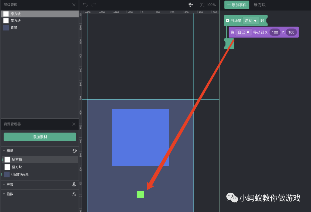 如图,有两个方块,一个大的蓝色方块,一个小的绿色的方块,游戏开始后,我们使用积木设置绿色的小方块的位置为(100,100)。