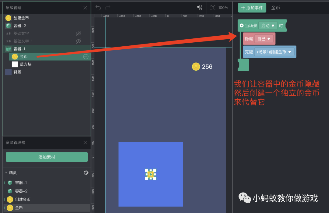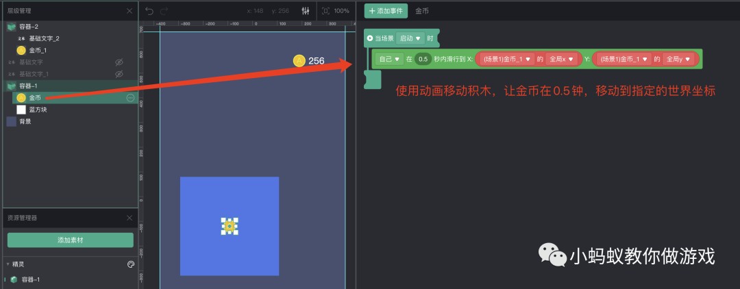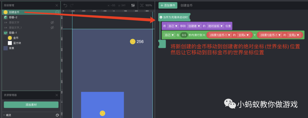 今天在制作游戏的过程中遇到了一个问题,原本我想让一个金币从游戏中的 A 点移动到 B 点。这个金币是一个容器中的精灵,当使动画积木去处理移动的时候,虽然指定了移动到的 B 点的世界位置,但是这个金币最终并没有到达指定的 B 点。