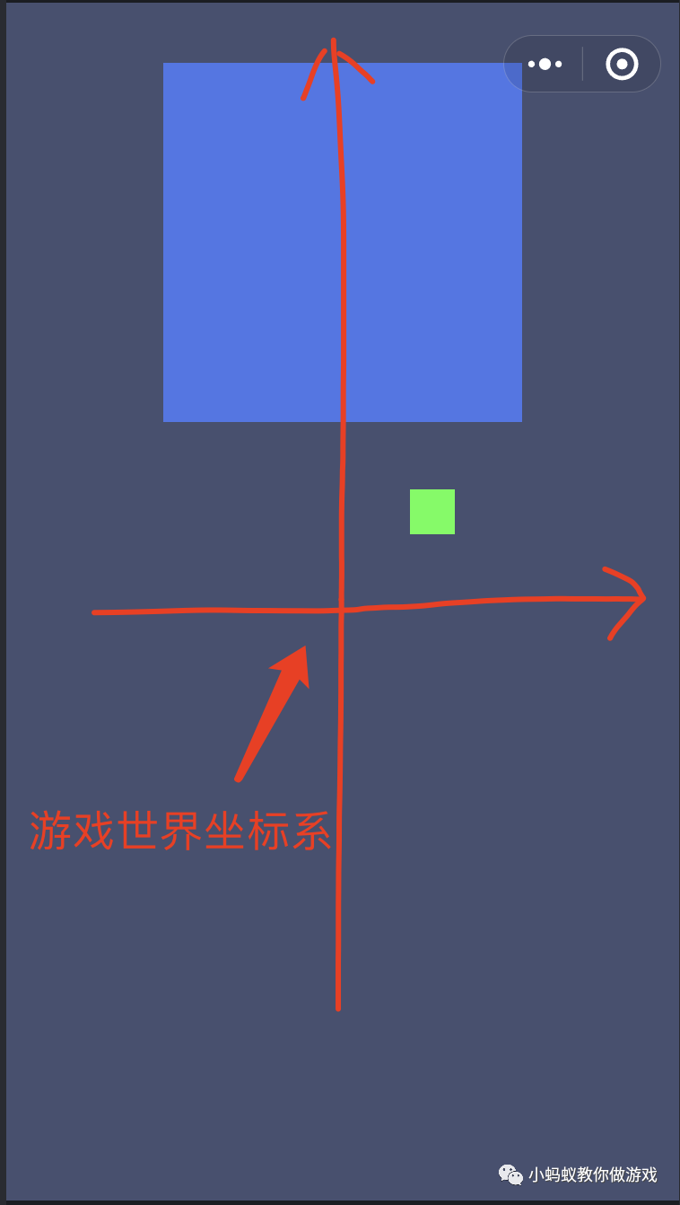 如图就是游戏中的两个坐标系了。一个是游戏世界的坐标系,它以整个游戏屏幕的中间为中点,一个是局部坐标系,它以游戏中的蓝色方块的中心为中点。