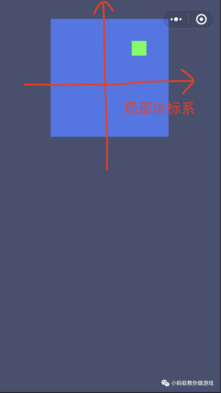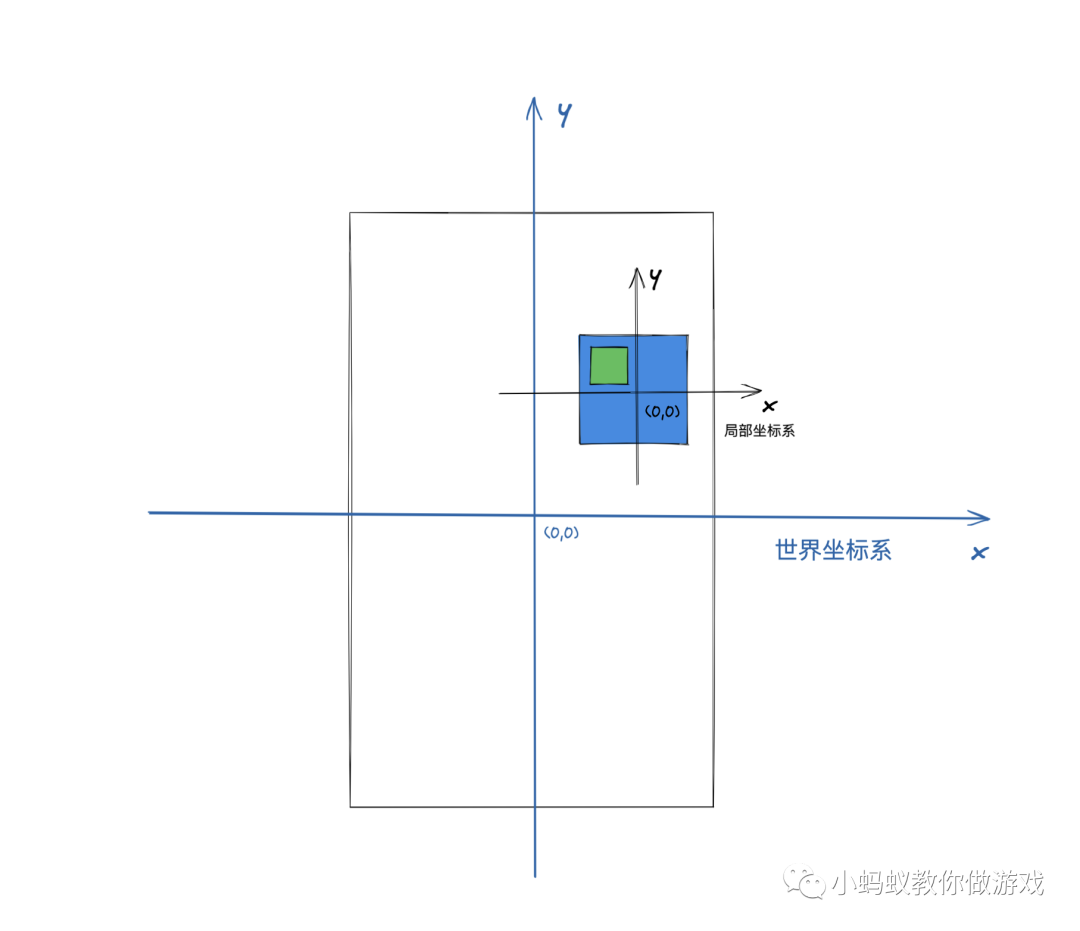 现在,我们假设绿色方块是蓝色方块容器中的一个精灵,此时当我们说绿色方块的位置时,就需要有一个前提,是以世界坐标系为参考,还是以局部坐标系为参考。因为在不同的坐标系中,绿色的方块的位置是不同的。