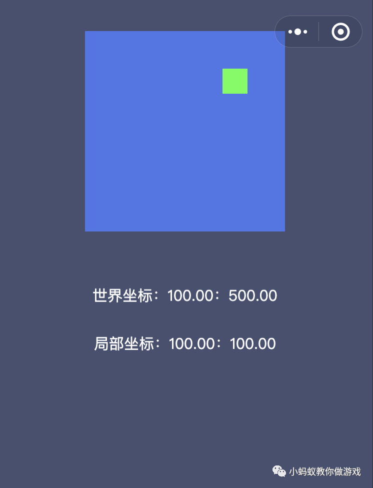可以看到,在世界坐标系中,绿色方块位于(100,500)的位置。在局部坐标系中,绿色方块位于(100,100)的位置。