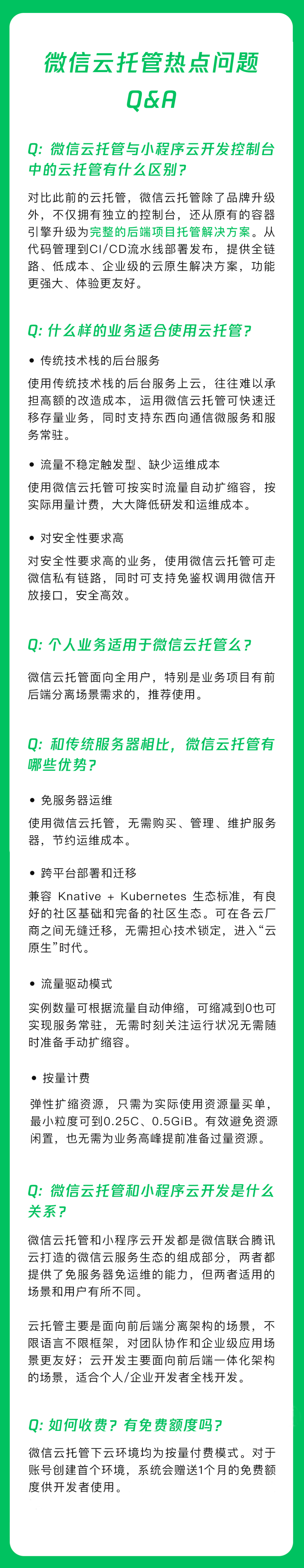 微信云托管是由微信团队联合腾讯云推出的后端项目全托管服务。对于微信生态应用开发采用前后端分离架构的场景,云托管可做到免运维免服务器管理,从代码管理到CI/CD流水线部署发布,提供全链路、低成本、企业级的云原生解决方案。