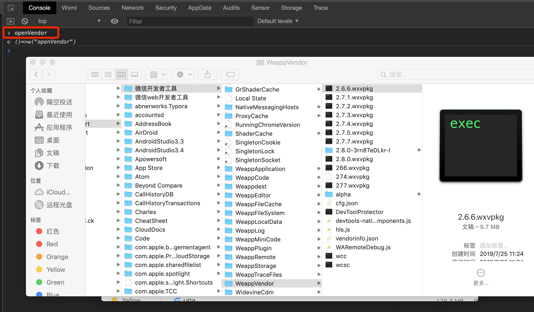 在微信小程序 IDE 控制台输入 openVendor 命令,可以打开微信小程序开发工具的资源目录