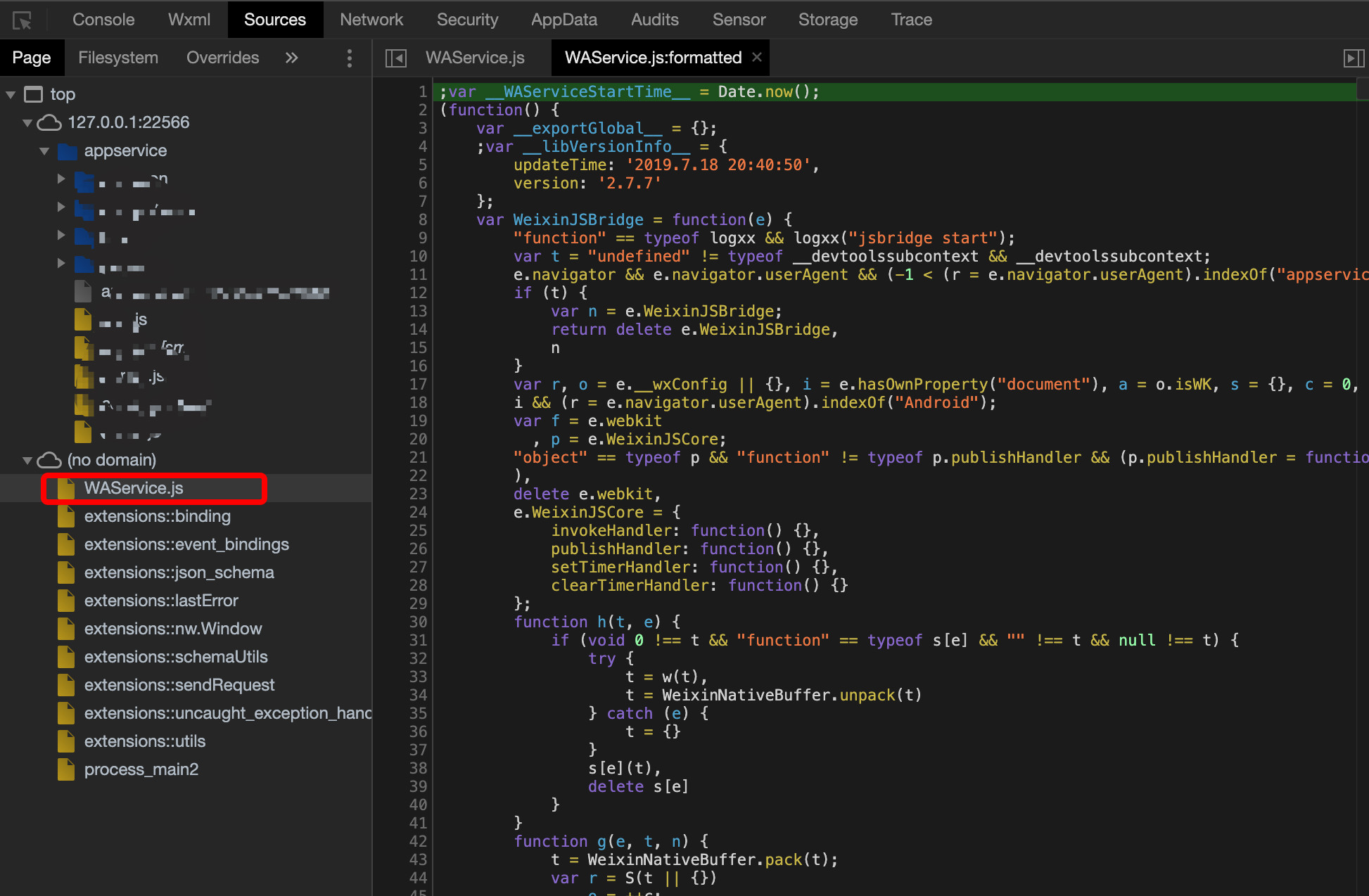 另外也可以只直接通过开发者工具的Sources面板查找到WAService.js的源码