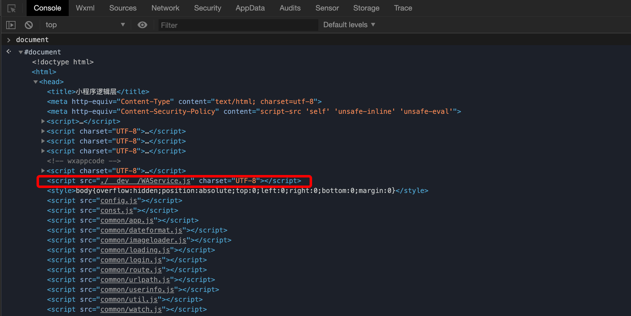 - 在微信开发者工具中,编译运行你的小程序项目,然后打开控制台,输入 document 并回车,就可以看到小程序运行时,WebView 加载的完整的 WAPageFrame.html,如下图: