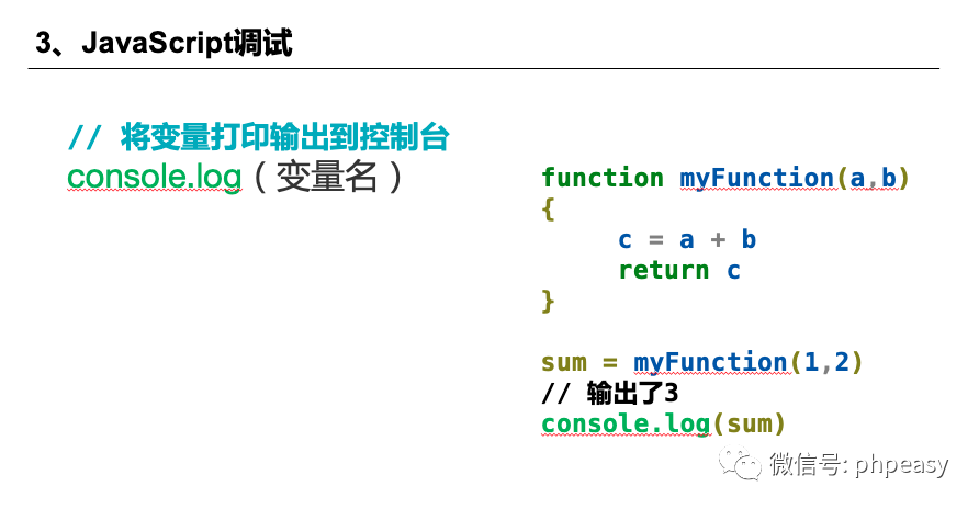 那么javascript是如何进行调试、修改bug的呢,我们一般使用console.log函数,该函数可以打印输出任何类型的数据。比如我们先调用我们之前定义的加法函数,将函数的执行结果赋值给sum,最后再调用console.log函数打印sum,就可以得到sum的值了,那么我们就可以根据这个值,判断我们定义的函数里是否存在bug了。