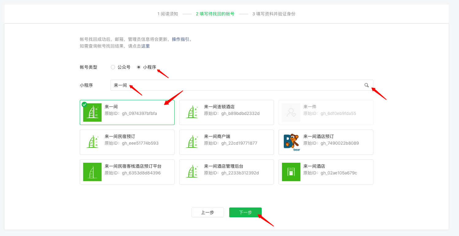选择小程序,输入要找回的小程序名称点放大镜图标搜索。然后选择你要找回的小程序,点下一步。