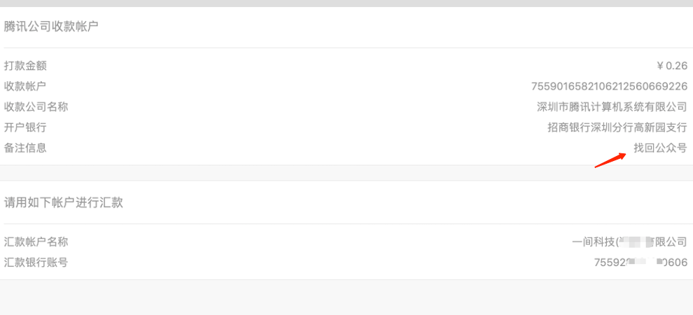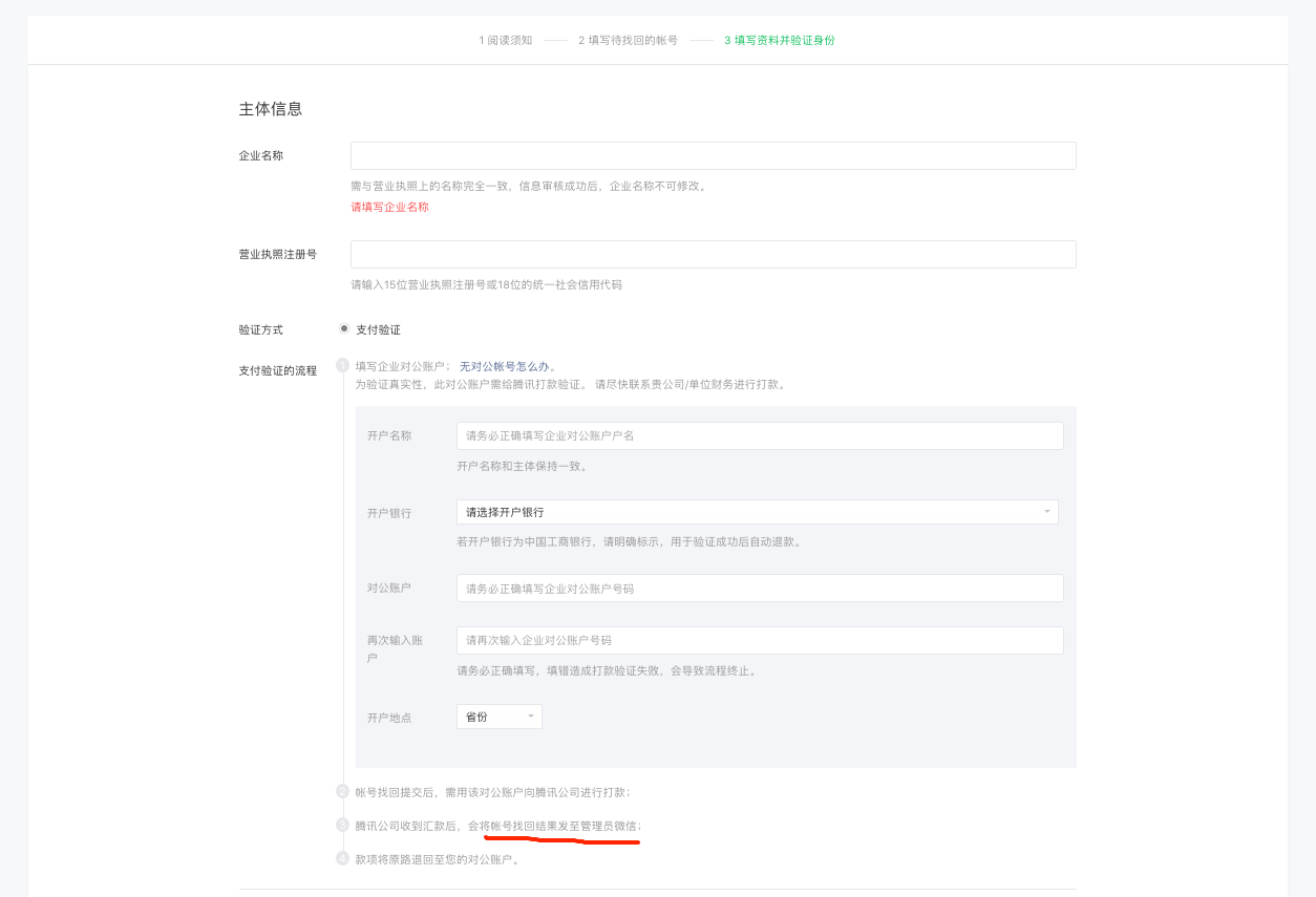 填主体信息、对公打款信息、管理员信息和登录邮箱。腾讯公司收到款项会把结果发到新的管理员微信。