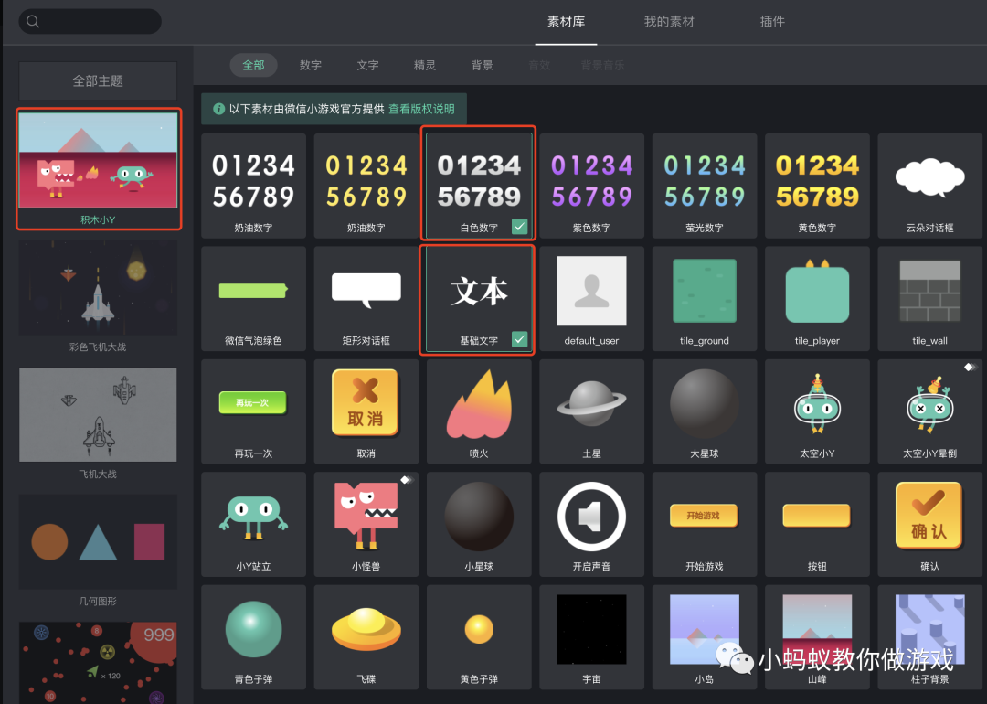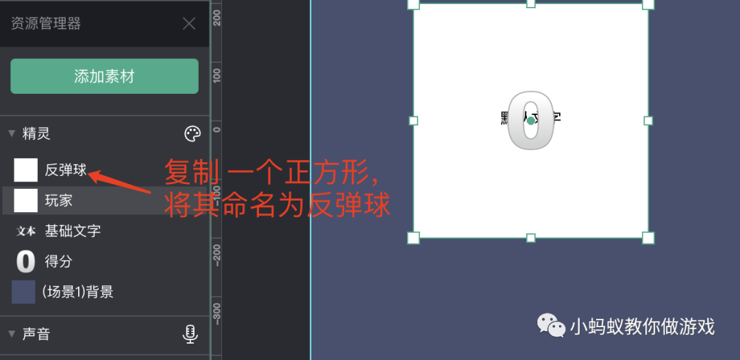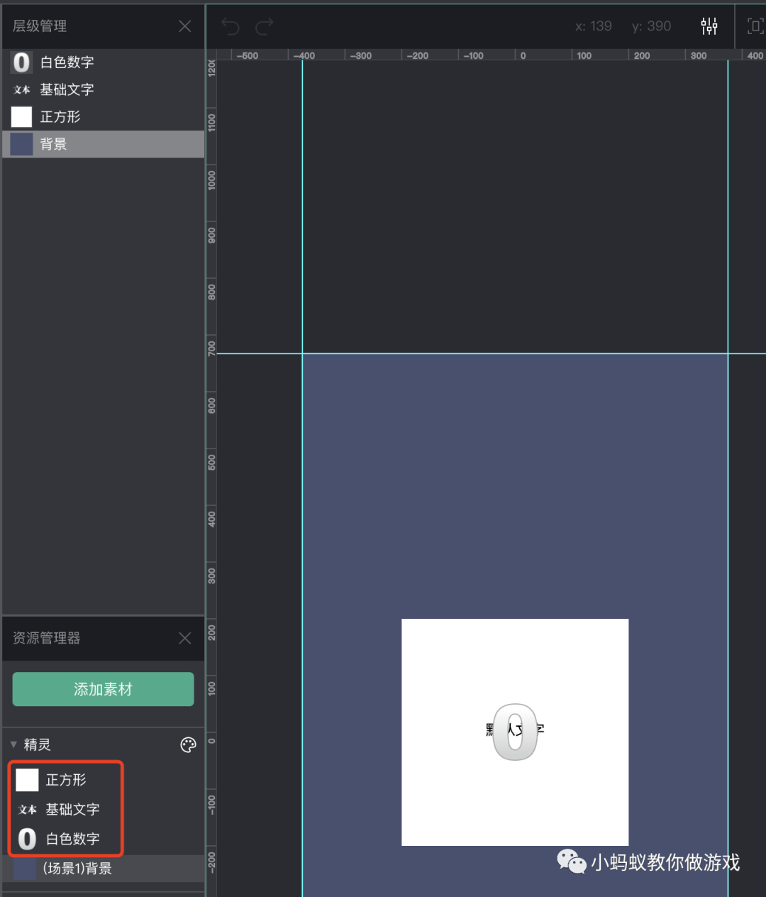 接着,点击“添加素材”按钮,增加游戏中所需要的素材,一个正方形,一个白色数字,以及一个基础文本。