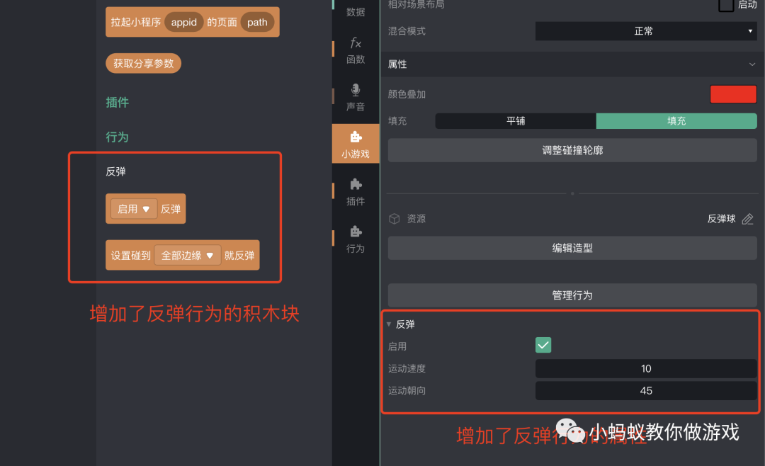 在开启“反弹”行为之后,会发生两处变化,一处是在属性区的下方增加了与反弹行为有关的属性,另一处是在积木区中增加了与“反弹”行为有关的积木块。