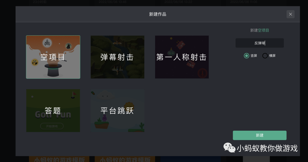 打开微信小游戏制作工具(官网:gamemaker.weixin.qq.com),新建作品,创建一个“反弹球”的空项目。