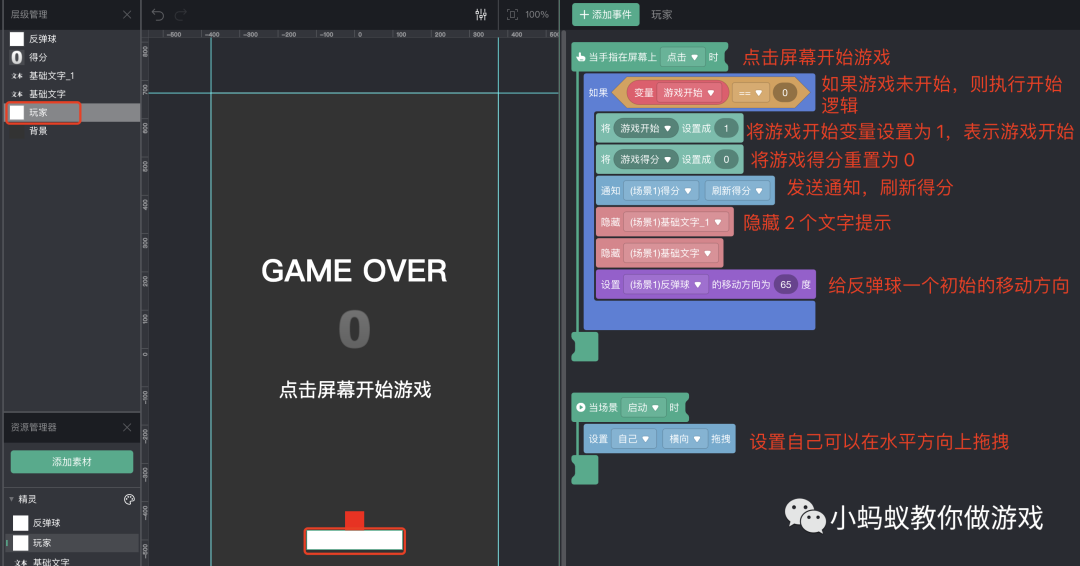 对于玩家的操作来讲,只需要一个“设置自己横向拖拽”的积木,即可实现在水平方向上的拖拽功能。另外,玩家这里也处理了游戏开始的逻辑,点击屏幕游戏开始,隐藏文字提示,重置游戏得分,设置游戏开始变量,最后给反弹球设置一个开始移动的方向。