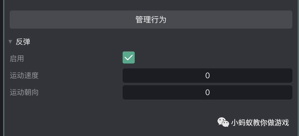 将反弹属性的“运动速度”和“运动朝向”都设置为 0,我们会在游戏逻辑中使用积木块设置反弹球的移动速度和朝向。