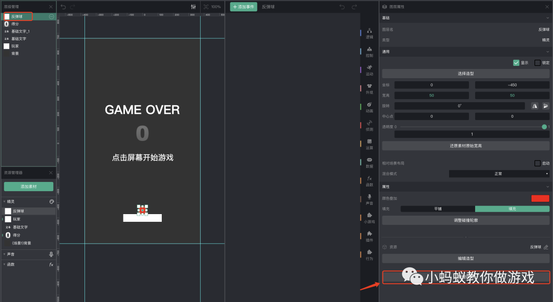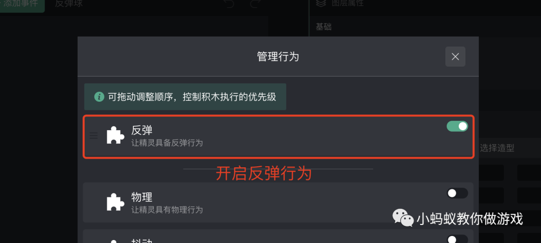 最后,实现“反弹球”的积木逻辑。想要实现反弹的效果,可以直接利用工具提供的“反弹”行为。