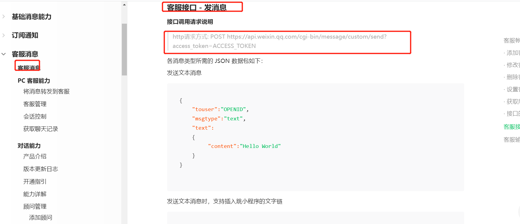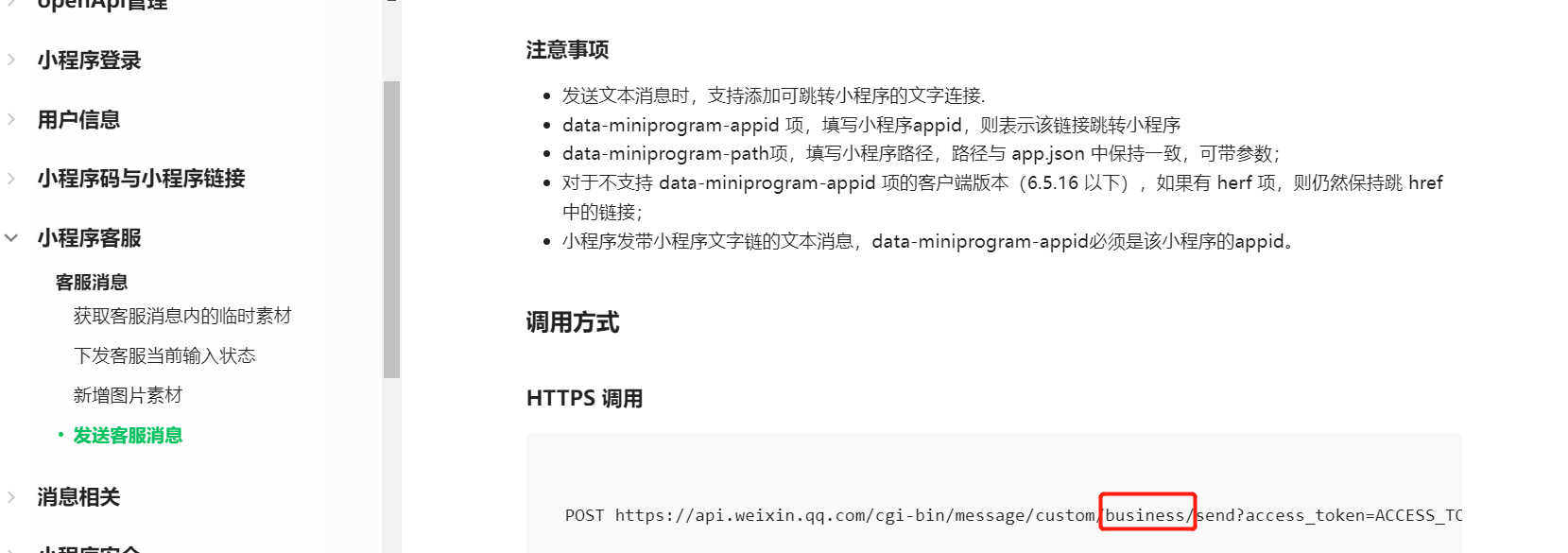 而文档链接 https://developers.weixin.qq.com/miniprogram/dev/OpenApiDoc/kf-mgnt/kf-message/sendCustomMessage.html 里的链接https://api.weixin.qq.com/cgi-bin/message/custom/business/send?access_token=ACCESS_TOKEN 是错误的,多了一个“business” 目录。