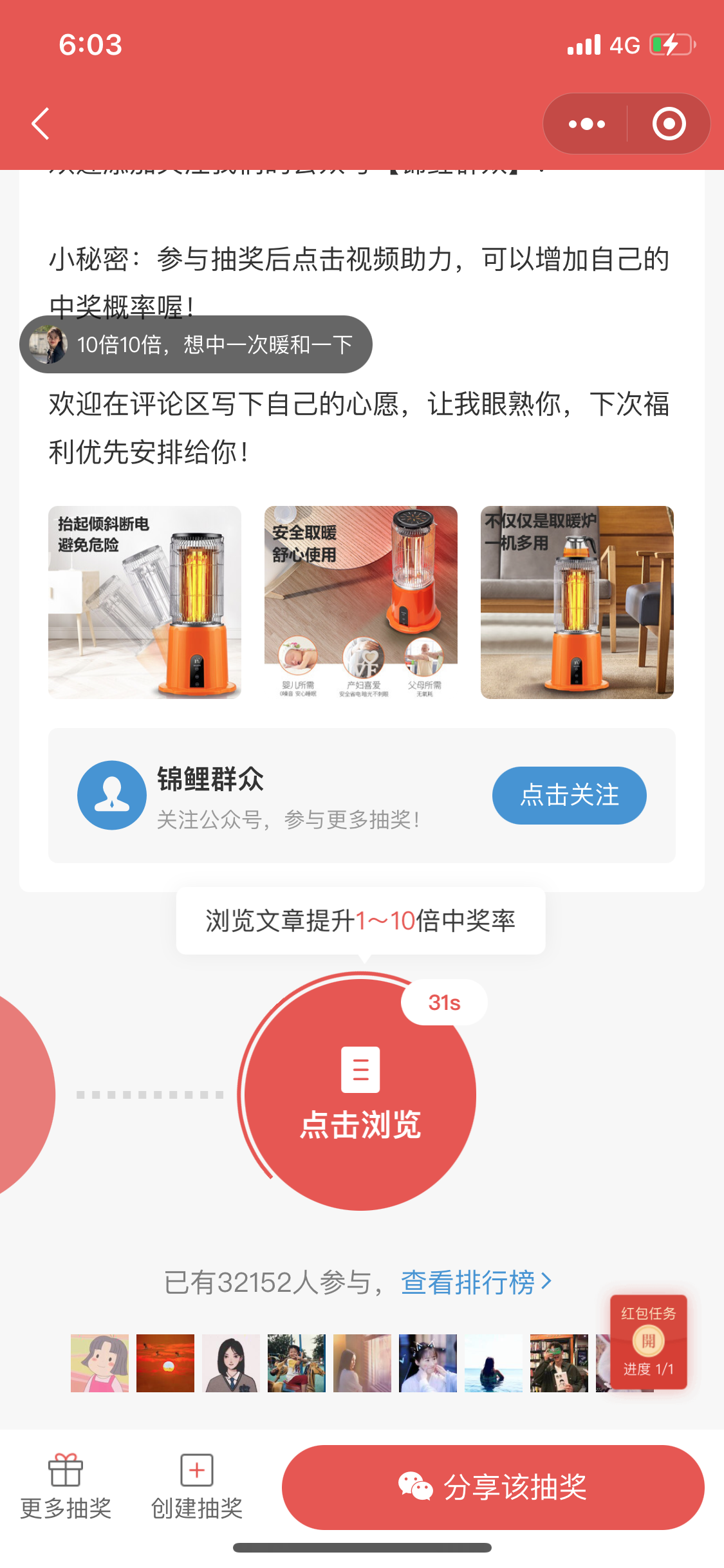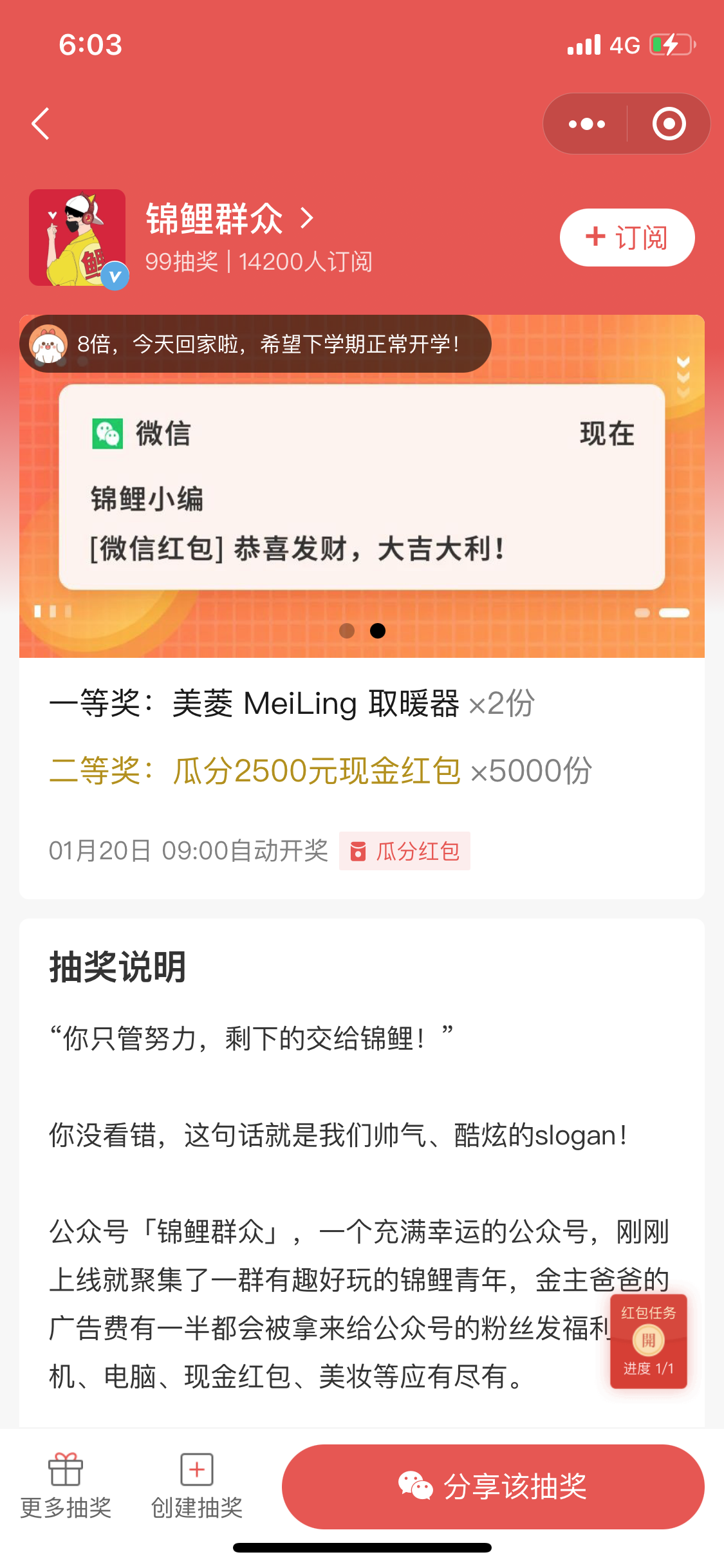 今天体验小程序抽奖模式为参加完成后引导用户去阅读